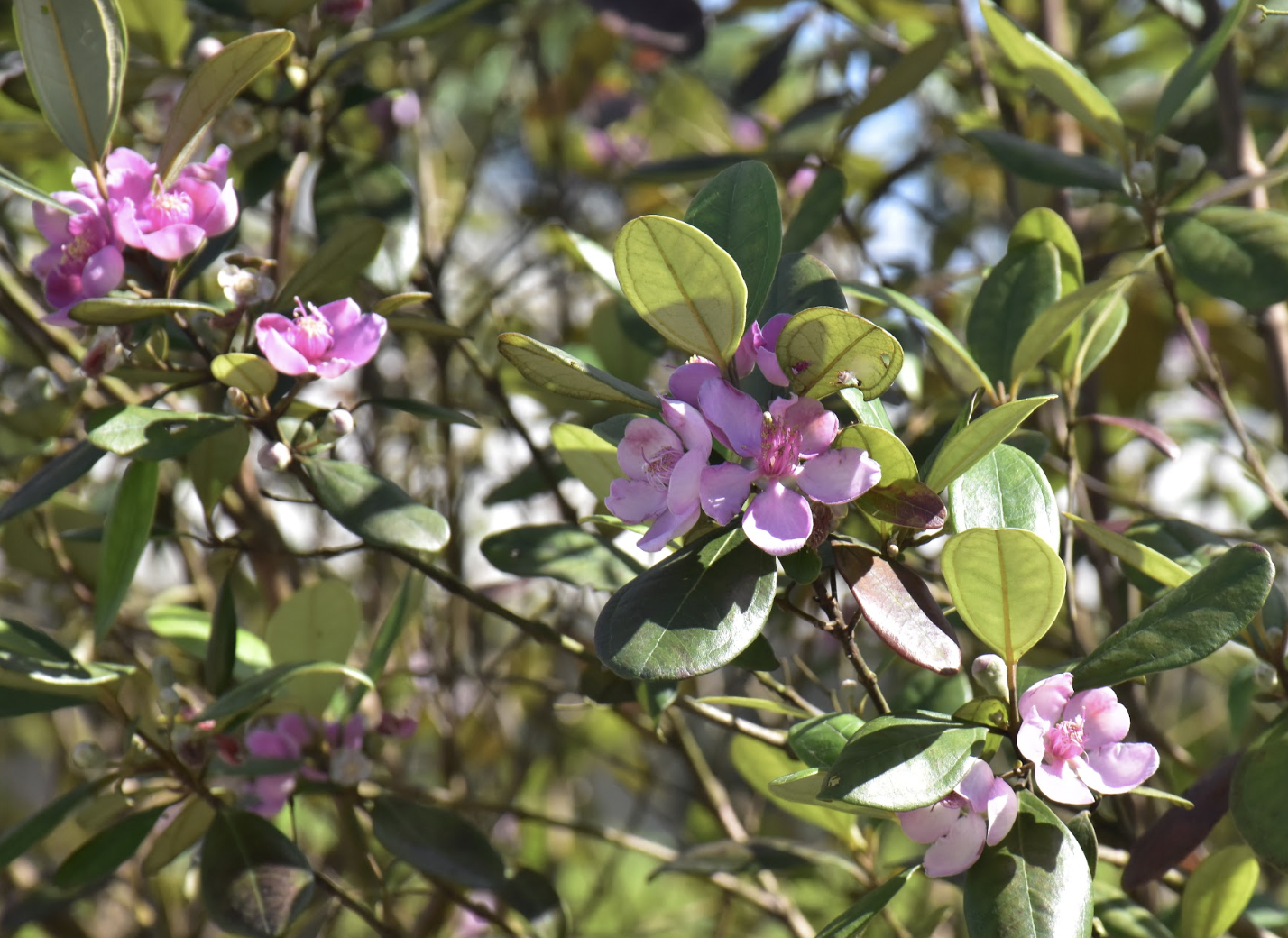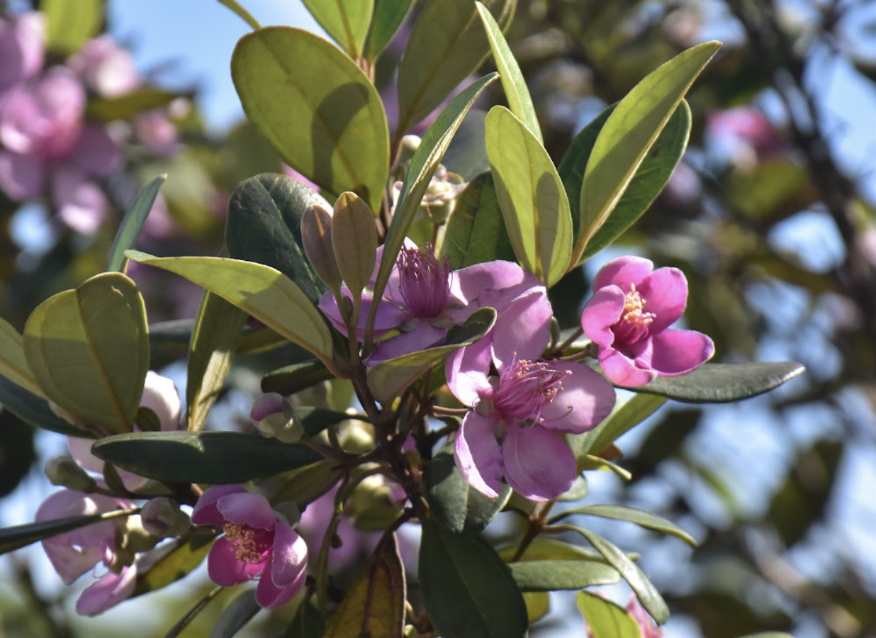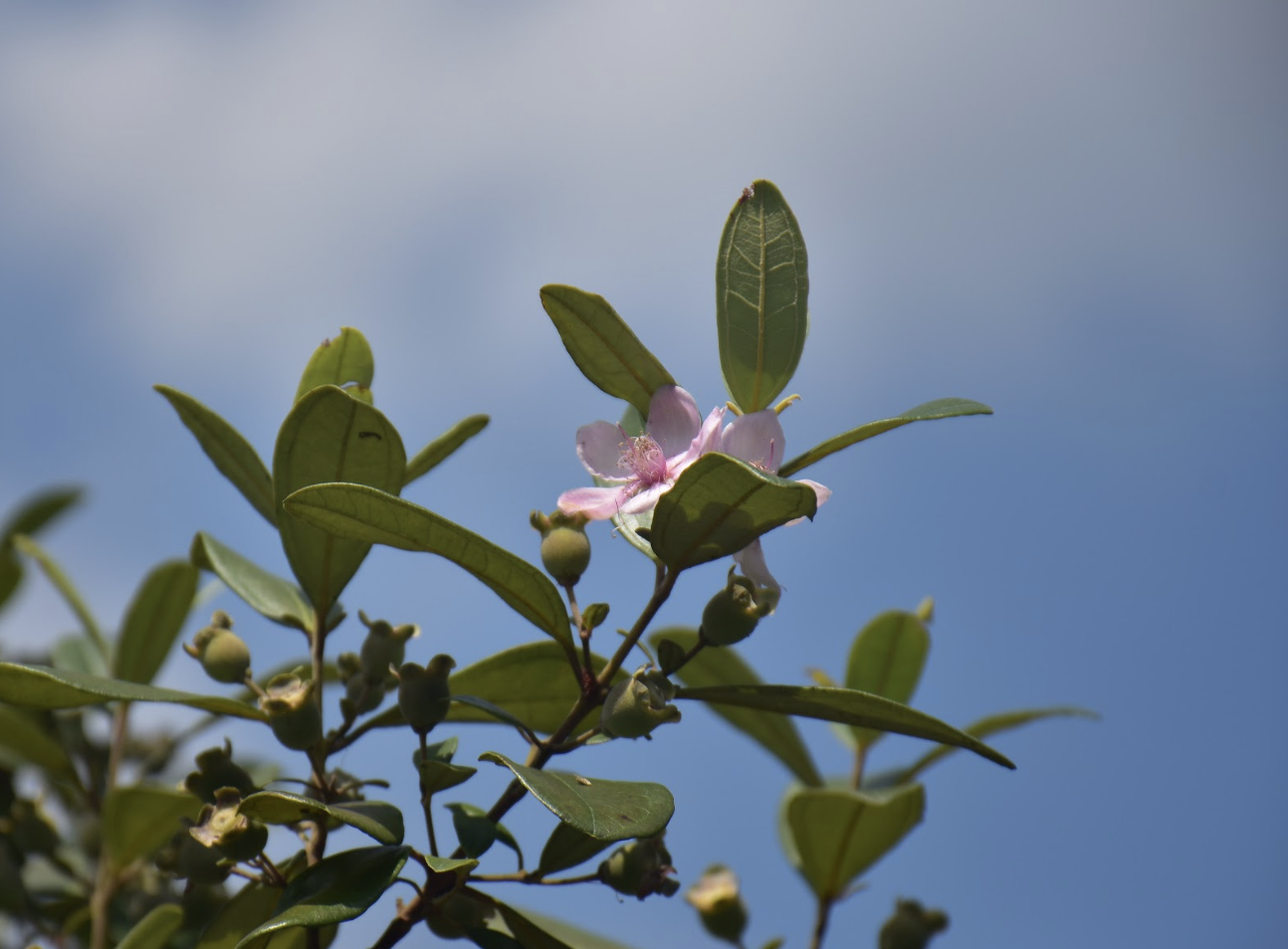 在近海丘陵地帶,綿延著一片密植的桃金孃樹。這種耐旱又抗風的灌木,原產於南亞和東亞,分布廣泛,尤其在台灣、琉球地區隨處可見。它的花朵美麗,顏色從白色、粉紅色到紫紅色不等,每當春夏之交,桃金孃便開始綻放它那5瓣花的光彩,吸引著無數賞花者。